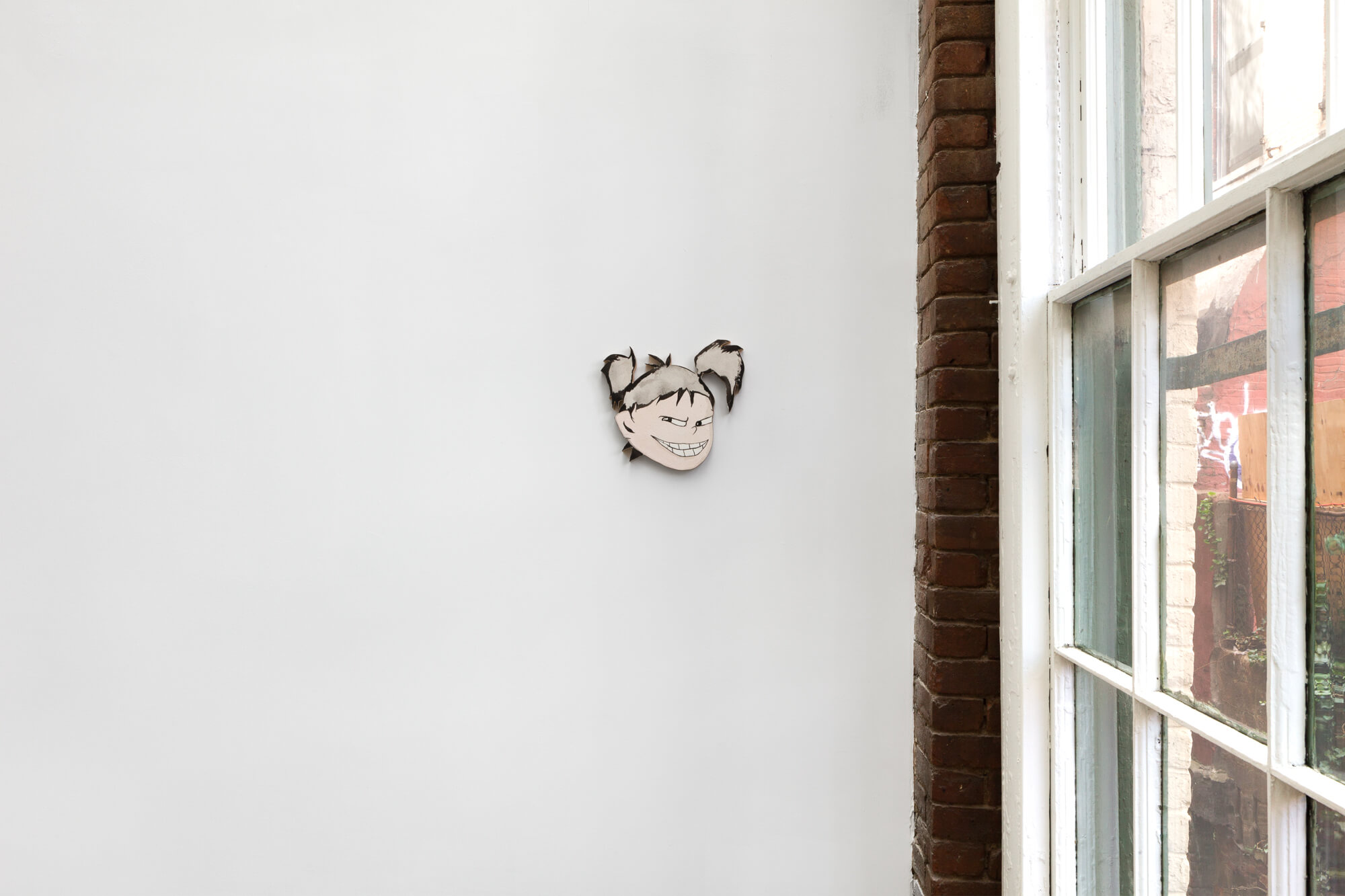 Calame’s labyrinth, seen from above, forms the shape of a paperclip. In order to comprehend the structure, one has to follow the architect’s path, moving through a series of narrow, looping passageways. Parallels between the development of a city and a self are drawn in the center of the sculpture, where a small screening area shows a series of video episodes made in collaboration with Coralie Rouet. In the videos, inspired by the commedia dell’arte character of Pulcinella, Calame roams city streets, telling stories, and acting as a tour guide.