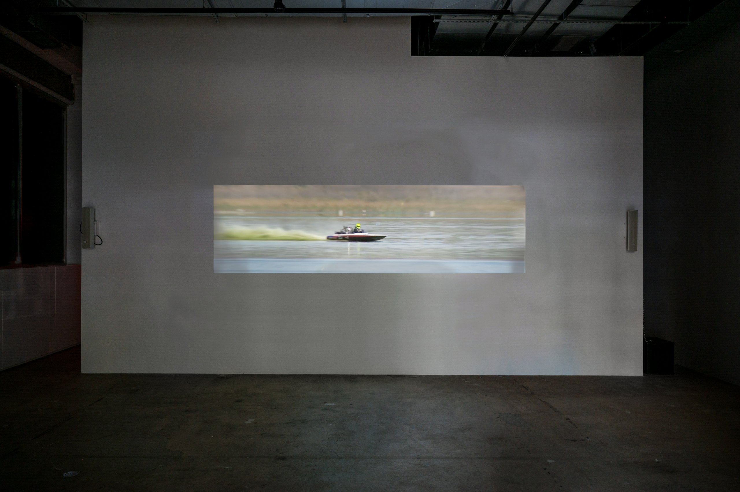 15’36”, by Beijing-based artist Yu Honglei, collapses found footage of humans, animals, plants, and machines into an ever-accelerating collage of moving images with propulsive, kinetic energy. Yu depicts movement over, across and into Earth’s landscapes: a horse and rider are shown swimming from below, a remote-controlled amphibious vehicle skitters across shallow water, a man in a wetsuit wrestles with a geoduck deep within the sediment of a riverbed, and racing snowmobiles launch from a starting line. Yu employs a strobing form of intercutting which layers crowd scenes with shots of speeding cars and motorcycles, as well as depictions of flora and fauna. Set to a varied and disquieting score that merges drone sounds, plucked strings, revving engines, military marches and hardcore techno, 15’36” escalates into a flickering impression of simultaneity, in which relentless action locks into a tense and disorienting rhythm.