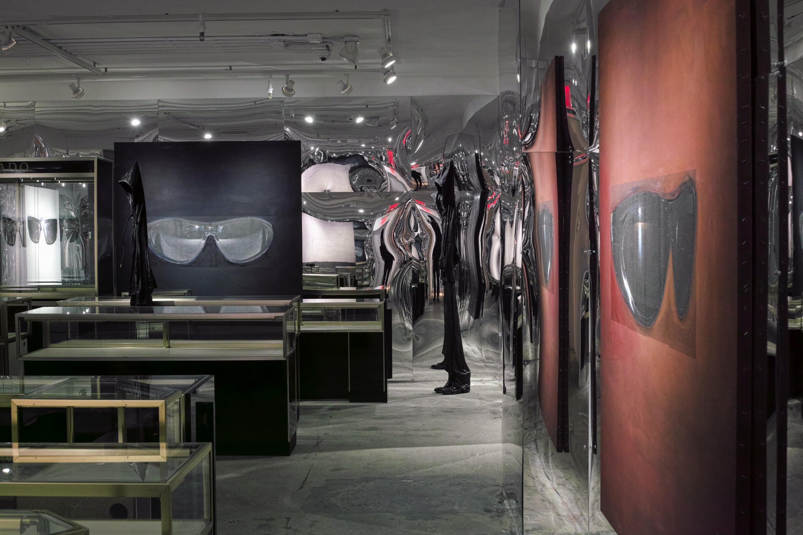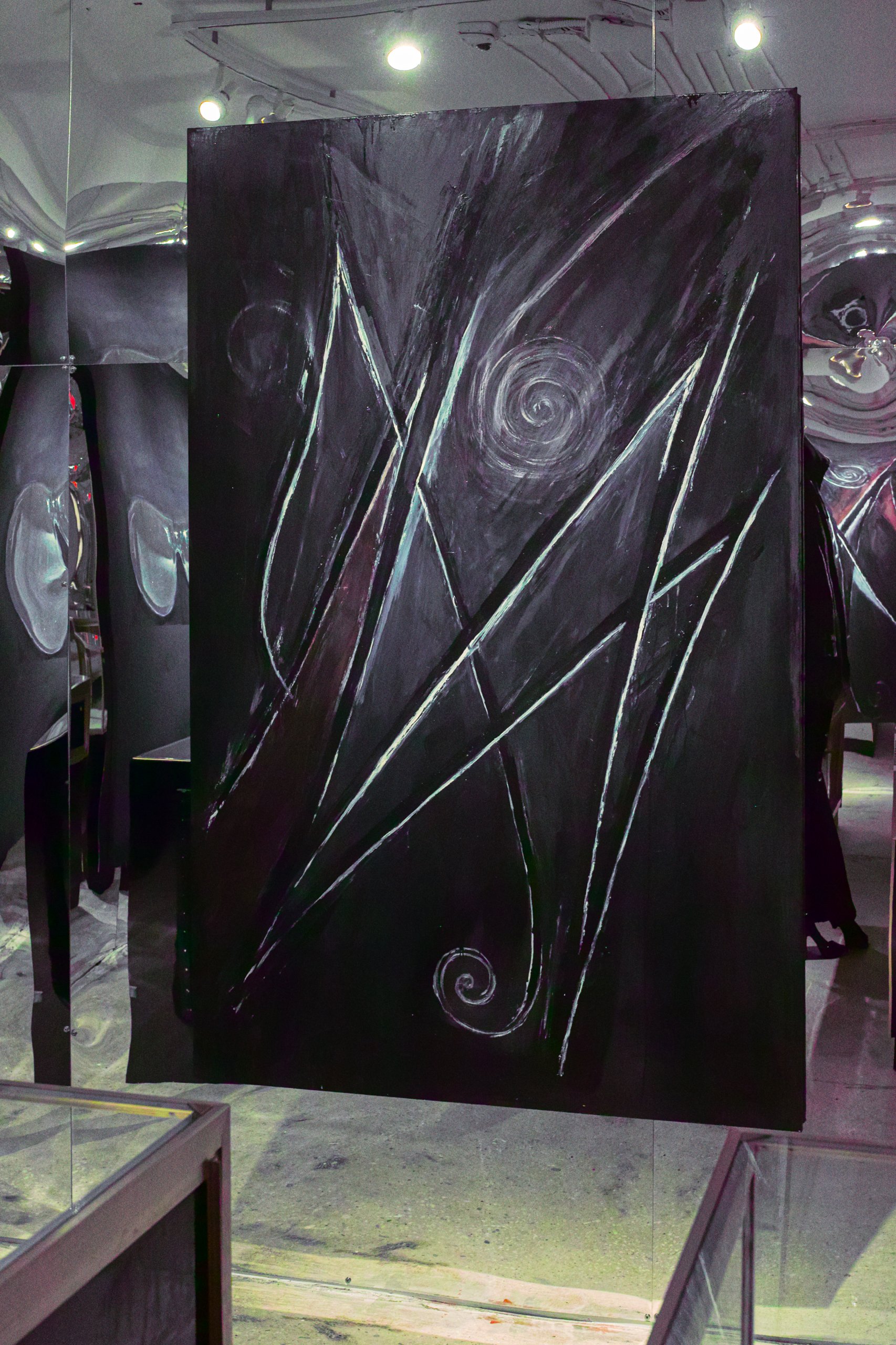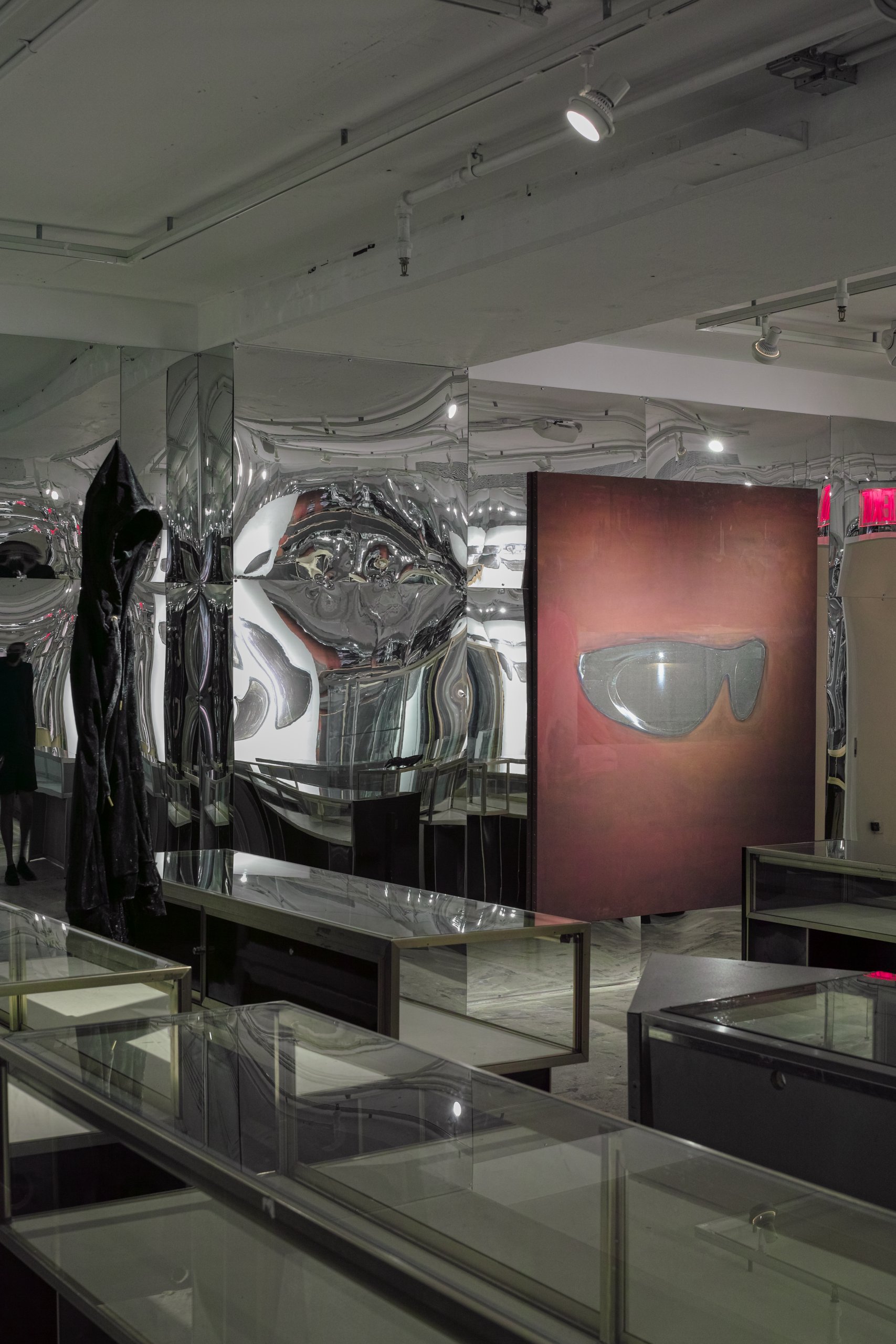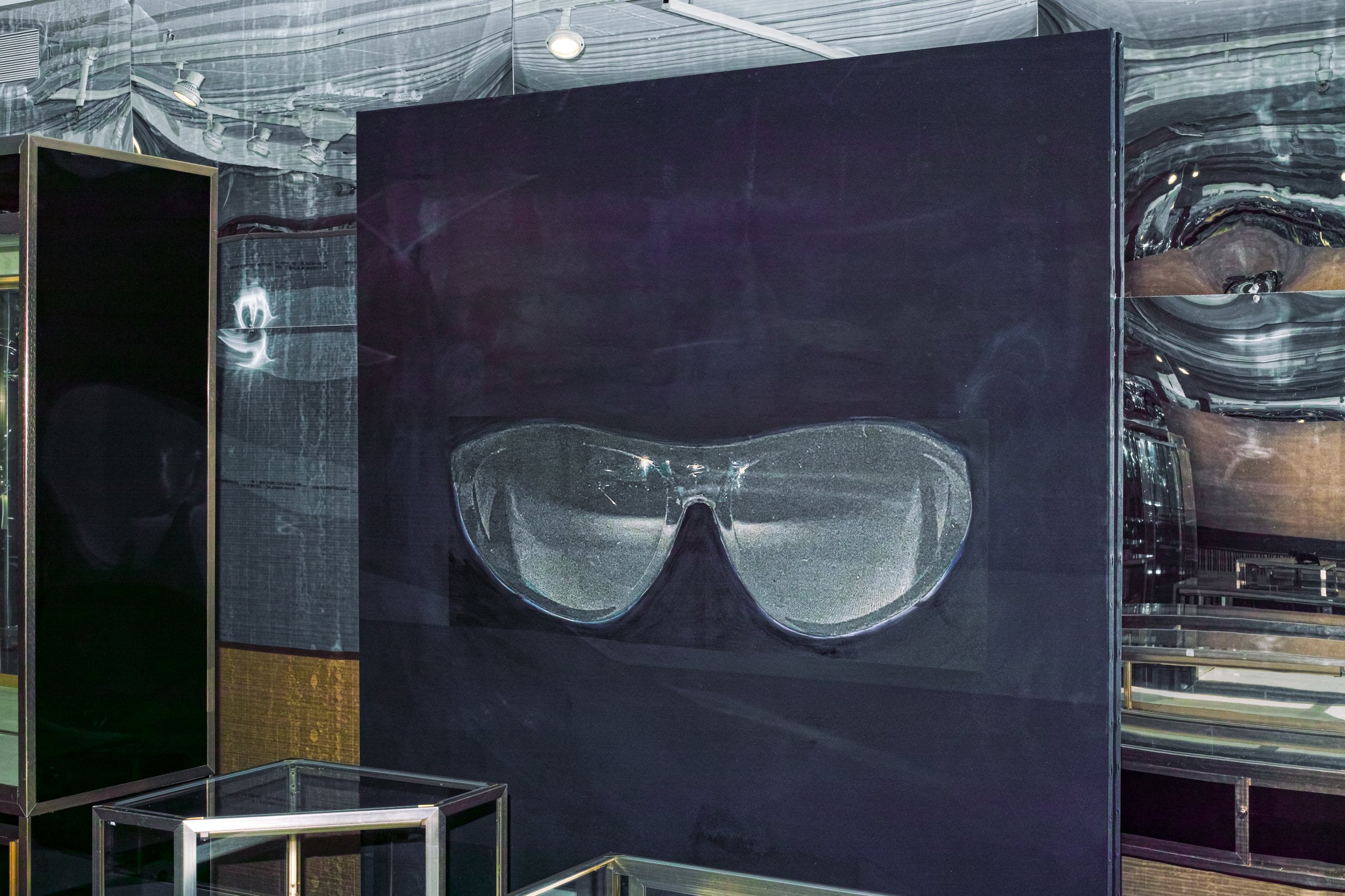 The exhibition unites many of the concerns of Spichtig's recent work, including the formation of icons, the superfluity of ornamentation, aggregations of everyday objects by typology, and reflections on voids and emptiness. At the center of the installation is a crowd of second-hand display cases, the kind designed for presenting accessories such as jewelry and sunglasses that call to mind the recent mass closures of New York retail stores, as well as Yves Klein’s exhibition of an empty cabinet, usually known as Le Vide (1958). As vitrines with glass and mirrored surfaces designed to guide the eye across a range of merchandise, they nonetheless obstruct and direct the view of Spichtig’s paintings, which hang on acrylic mirrors, lining the walls as they might in a fitness studio. Some of these paintings feature pairs of sunglasses which gaze out vacantly from the center of the canvas, while others are jagged ornamental abstractions with decorative embellishments that bear resemblances to those found in tattoos, street art and haute couture.