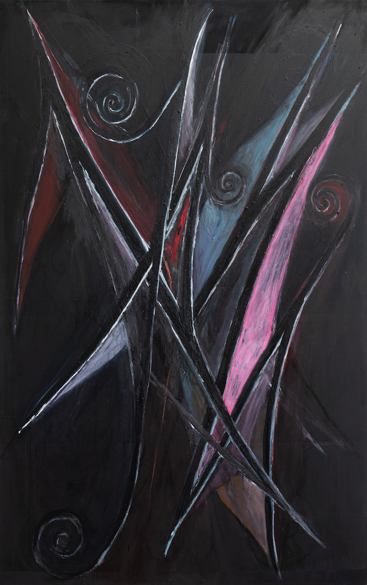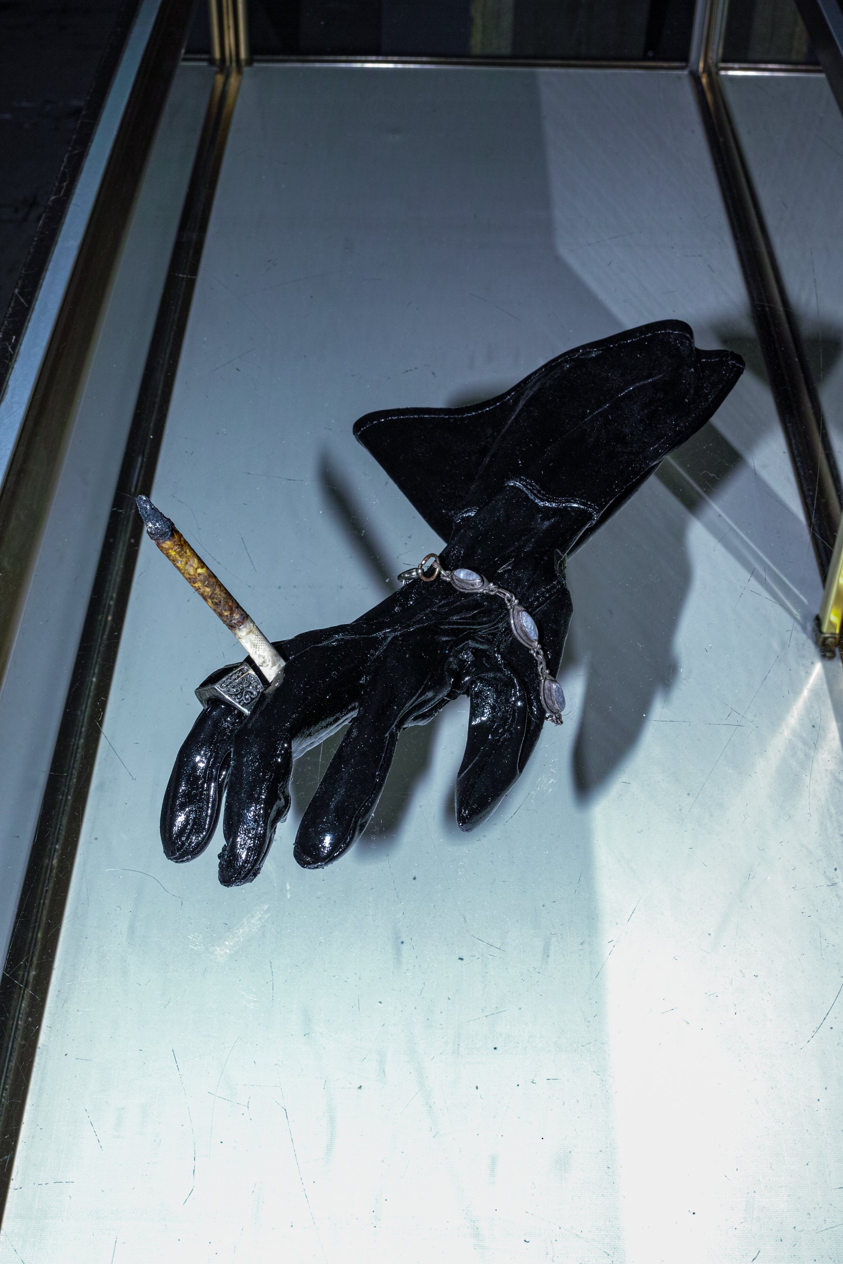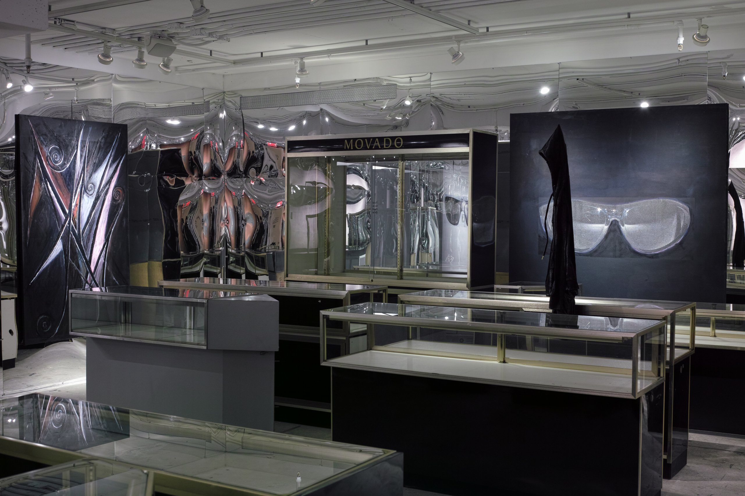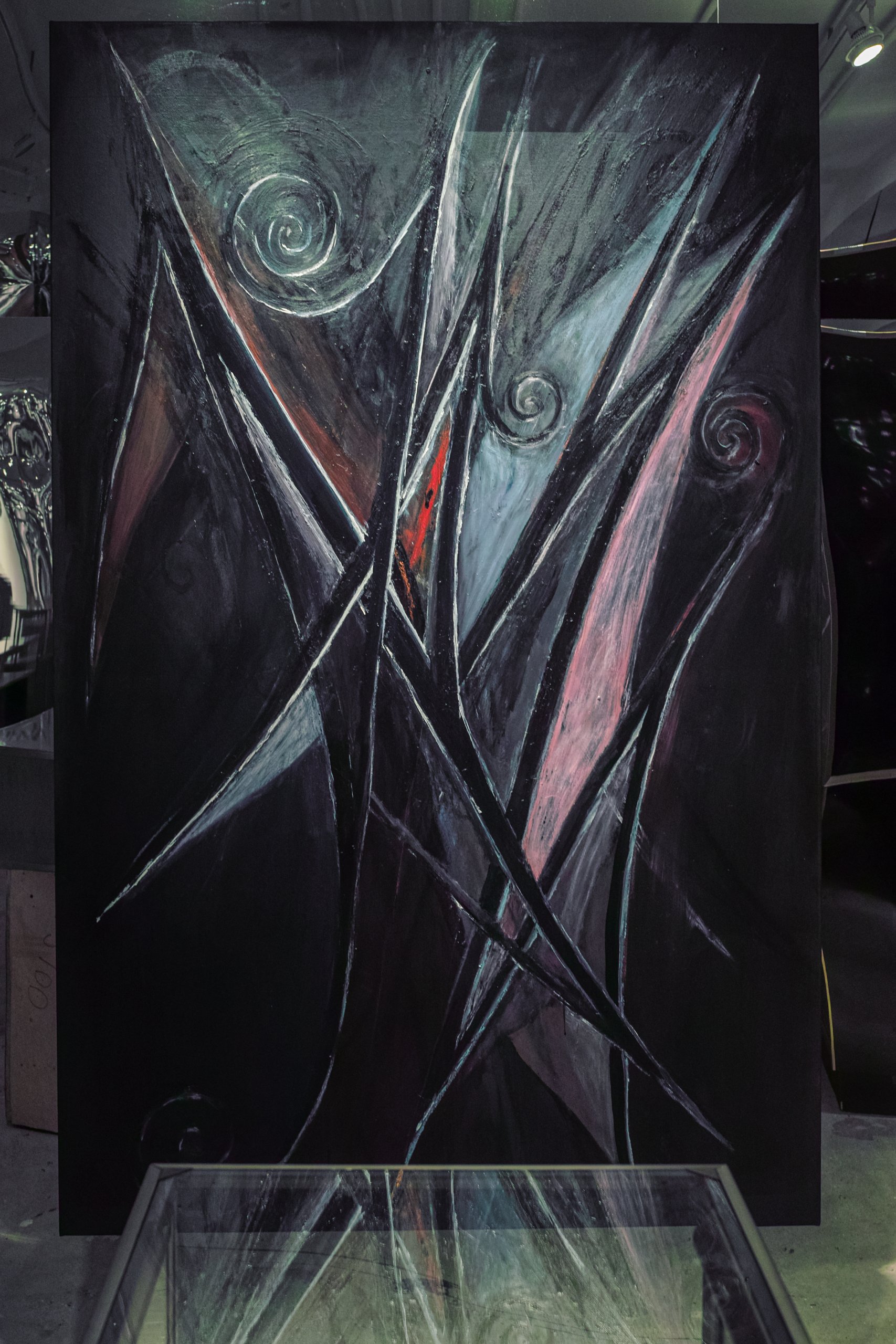 The exhibition unites many of the concerns of Spichtig's recent work, including the formation of icons, the superfluity of ornamentation, aggregations of everyday objects by typology, and reflections on voids and emptiness. At the center of the installation is a crowd of second-hand display cases, the kind designed for presenting accessories such as jewelry and sunglasses that call to mind the recent mass closures of New York retail stores, as well as Yves Klein’s exhibition of an empty cabinet, usually known as Le Vide (1958). As vitrines with glass and mirrored surfaces designed to guide the eye across a range of merchandise, they nonetheless obstruct and direct the view of Spichtig’s paintings, which hang on acrylic mirrors, lining the walls as they might in a fitness studio. Some of these paintings feature pairs of sunglasses which gaze out vacantly from the center of the canvas, while others are jagged ornamental abstractions with decorative embellishments that bear resemblances to those found in tattoos, street art and haute couture.