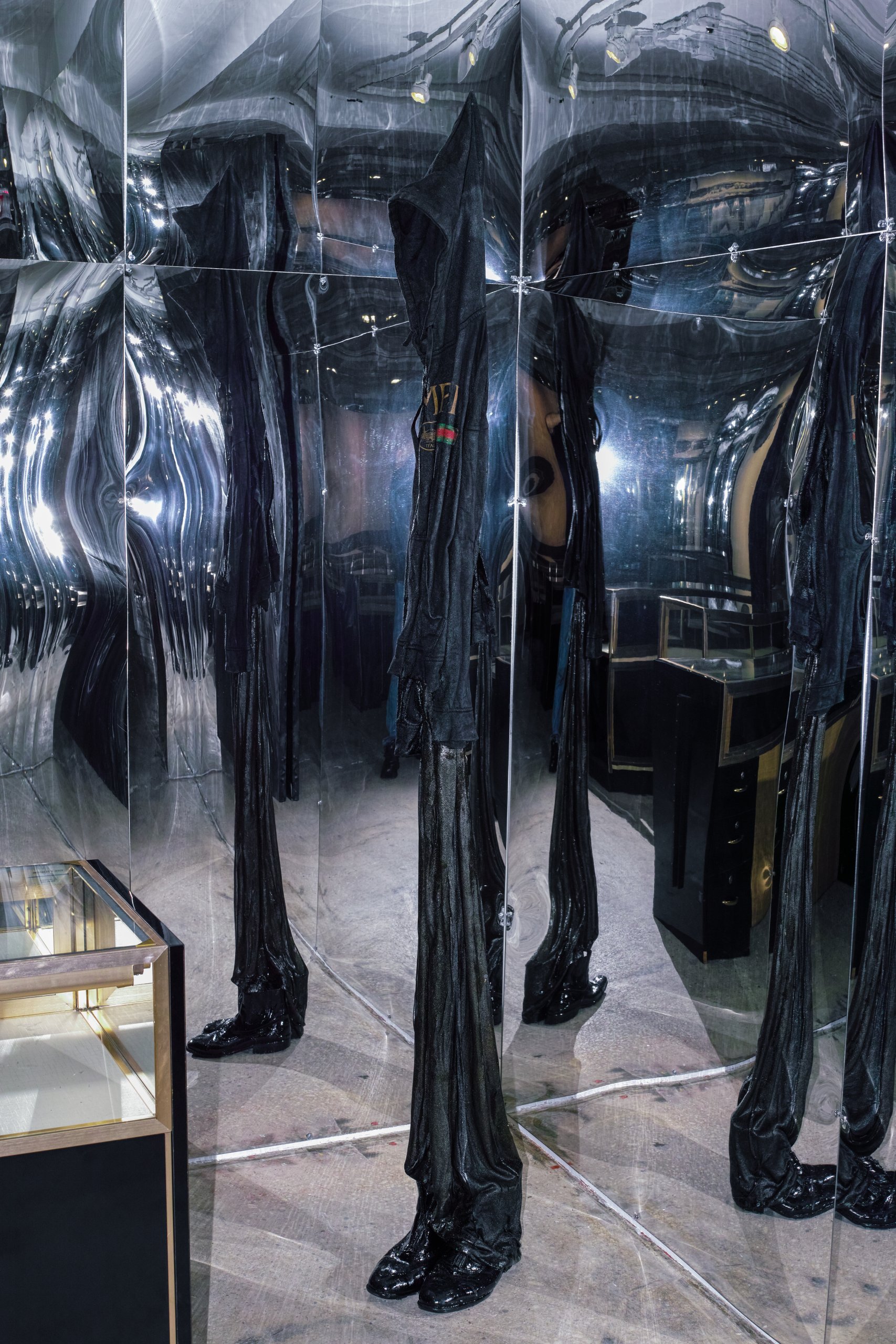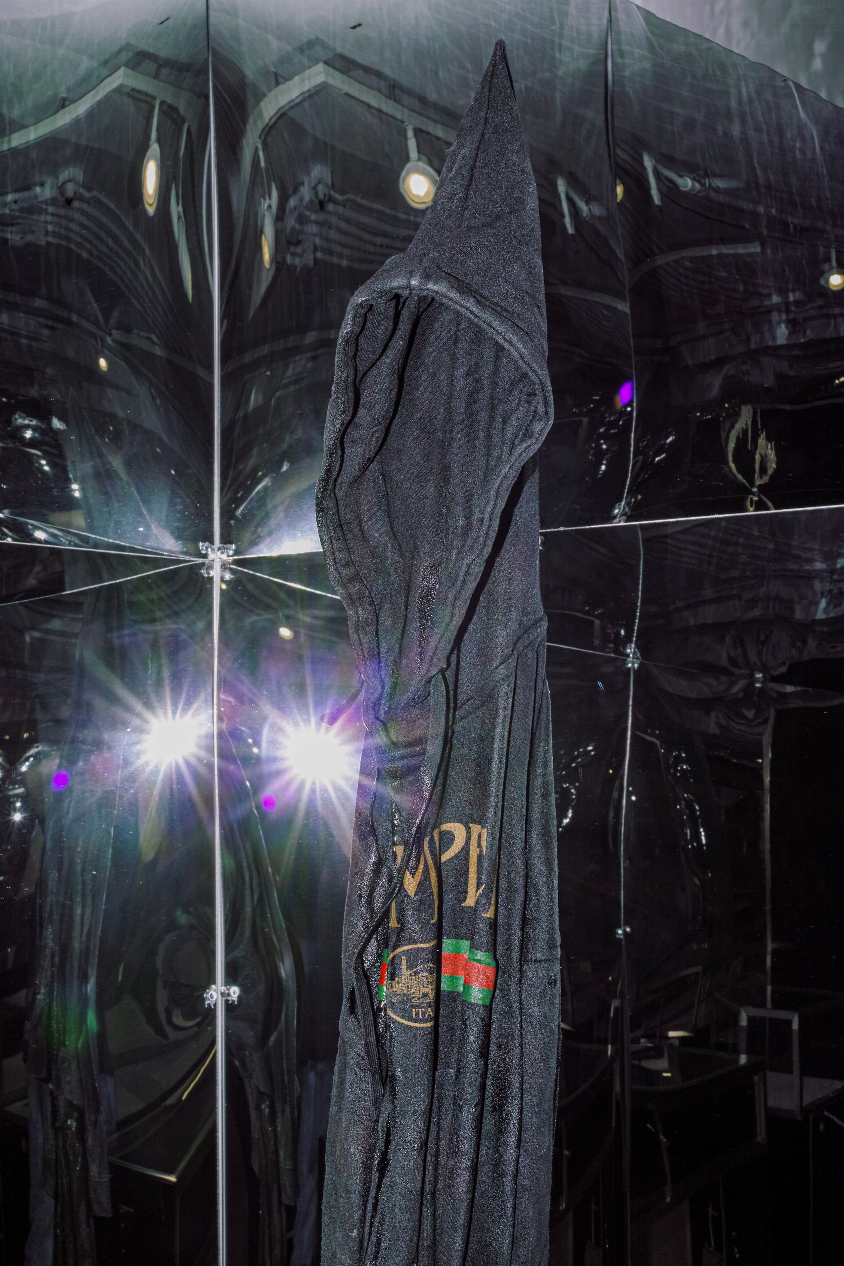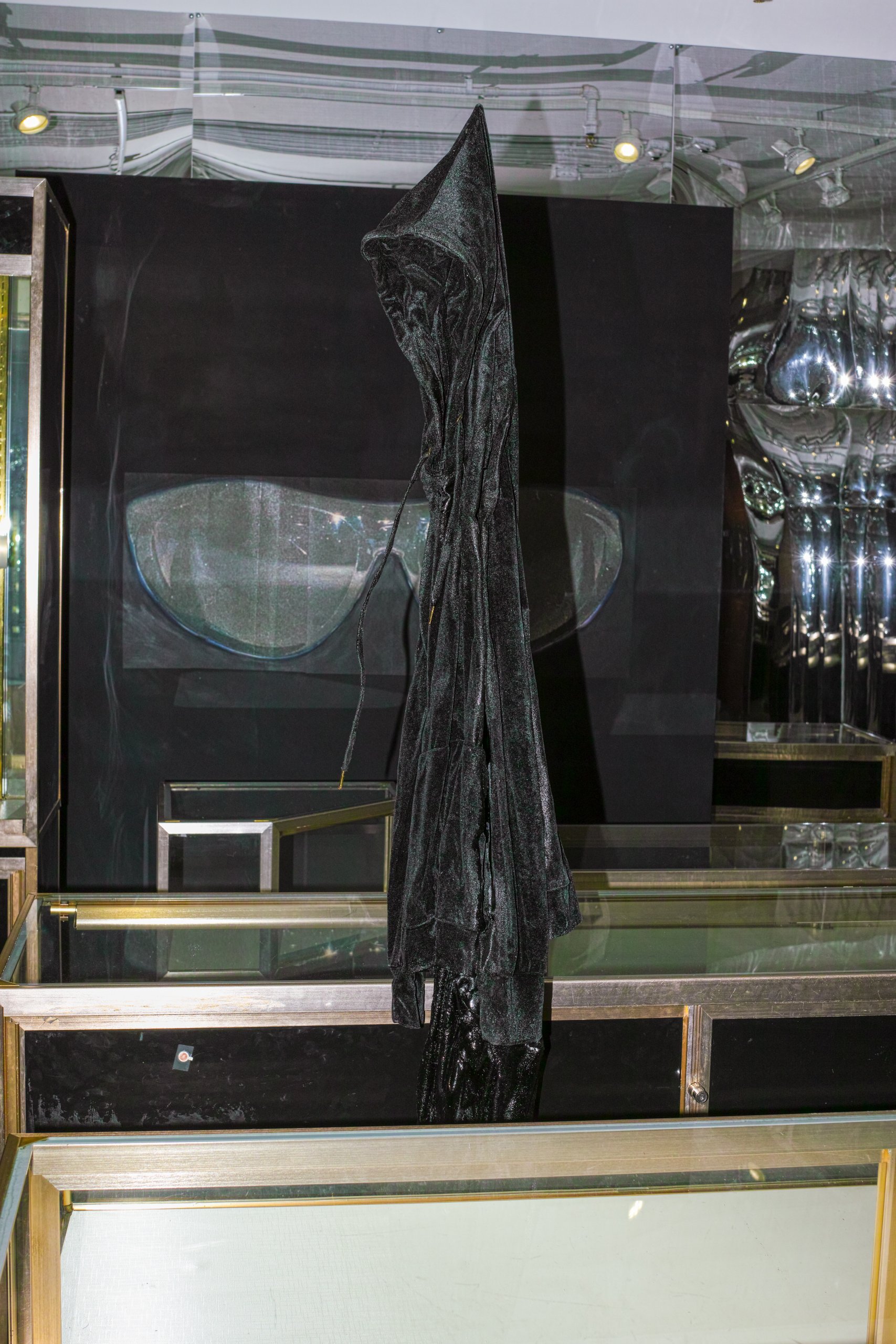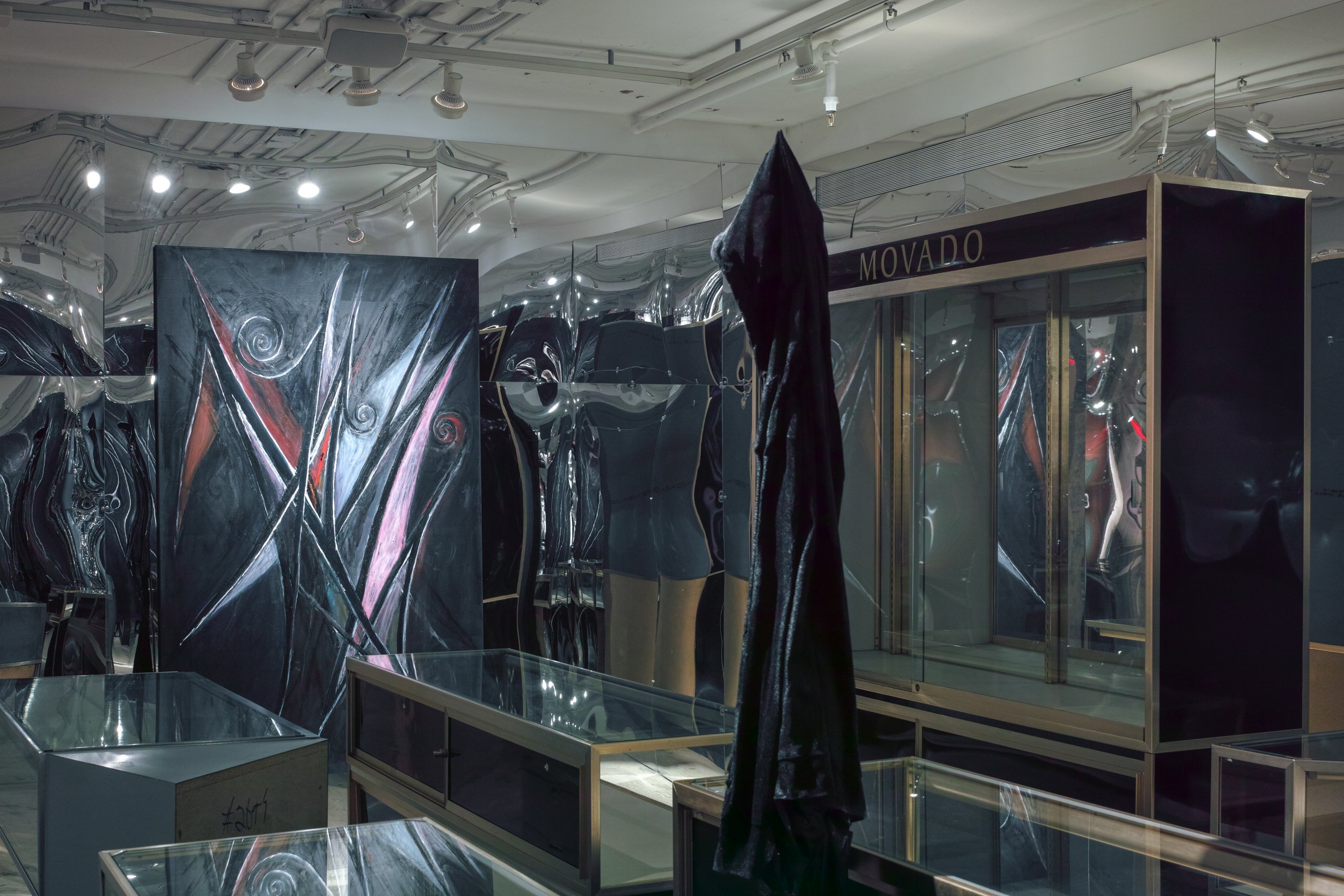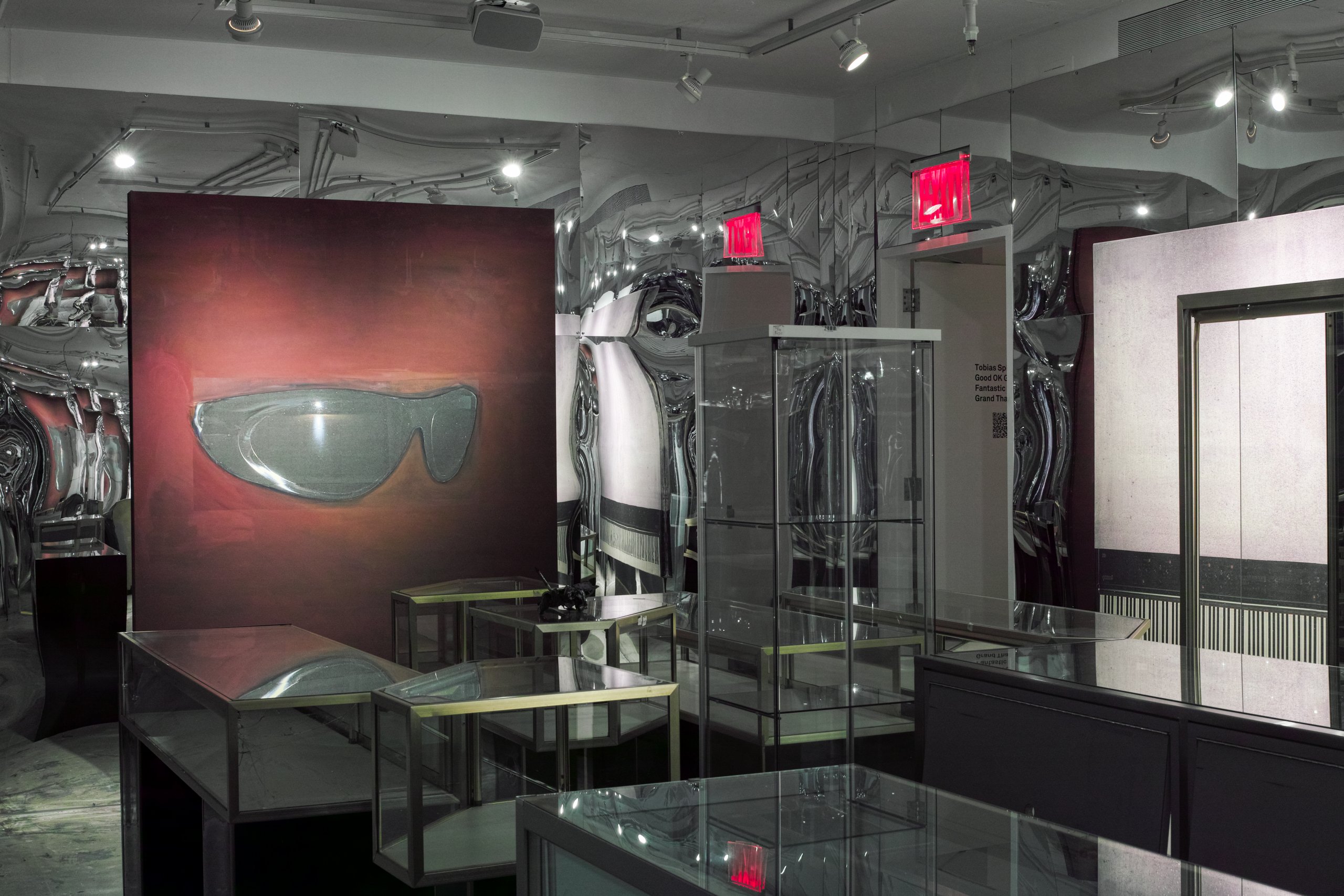 Good OK Great Fantastic Perfect Grand Thank You is the first institutional solo exhibition in the US by Tobias Spichtig (b. 1982, Sempach, Switzerland). The exhibition features new paintings on mirrored walls, partially obstructed by a glut of pre-used, empty retail display cases from shuttered stores. Two of the artist's humanoid sculptures – hollow, elongated figures made from garments – preside over the scene.