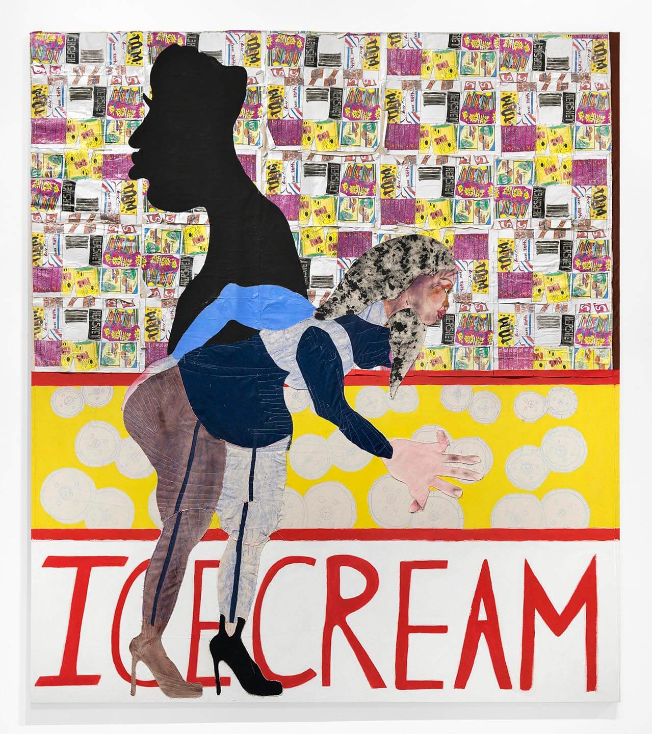 Ice Cream, 2017. Colored pencil, photocopies of hand-colored drawings, acrylic paint, Flashe (vinyl emulsion paint), fabric and painted canvas on canvas. 243.8 x 213.4 cm (96 x 84 in).