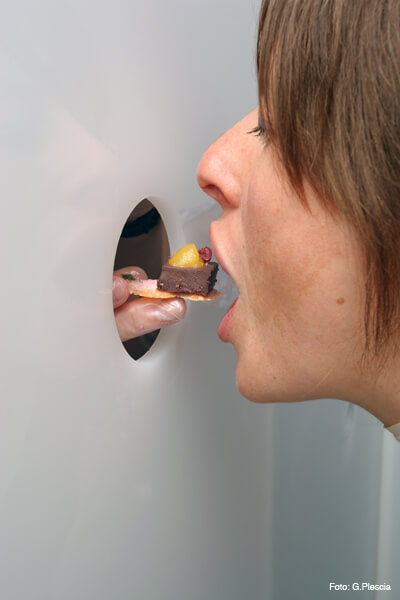 For WANDBISS, small parties of fair-goers may reserve sessions inside the “biting room,” a private chamber in which participants are fed gourmet hors-d’oeuvres through small holes in the walls and ceiling. Eating is by mouth only: most bites will be fed by skewer or edible utensil (vegetables, breadsticks, etc.), and ceiling bites lowered on strands of seaweed or bean noodles, so that the biting experience may remain hands-free. Staffed by a reservationist and a team of expert feeders, and with a menu of Portnoy’s own design, WANDBISS promises gustatory delights and a respite from the norms of art fair sociability.