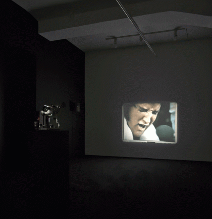 Sasnal’s new installation “Untitled” consists of a 16-mm film loop with sound, based on found footage of several Elvis performances. Rather than splice together archival film, Sasnal presents clips from YouTube filmed on the screen of a laptop. The film begins with an early performance and is followed by a recording of one of Elvis’ last onstage appearances.