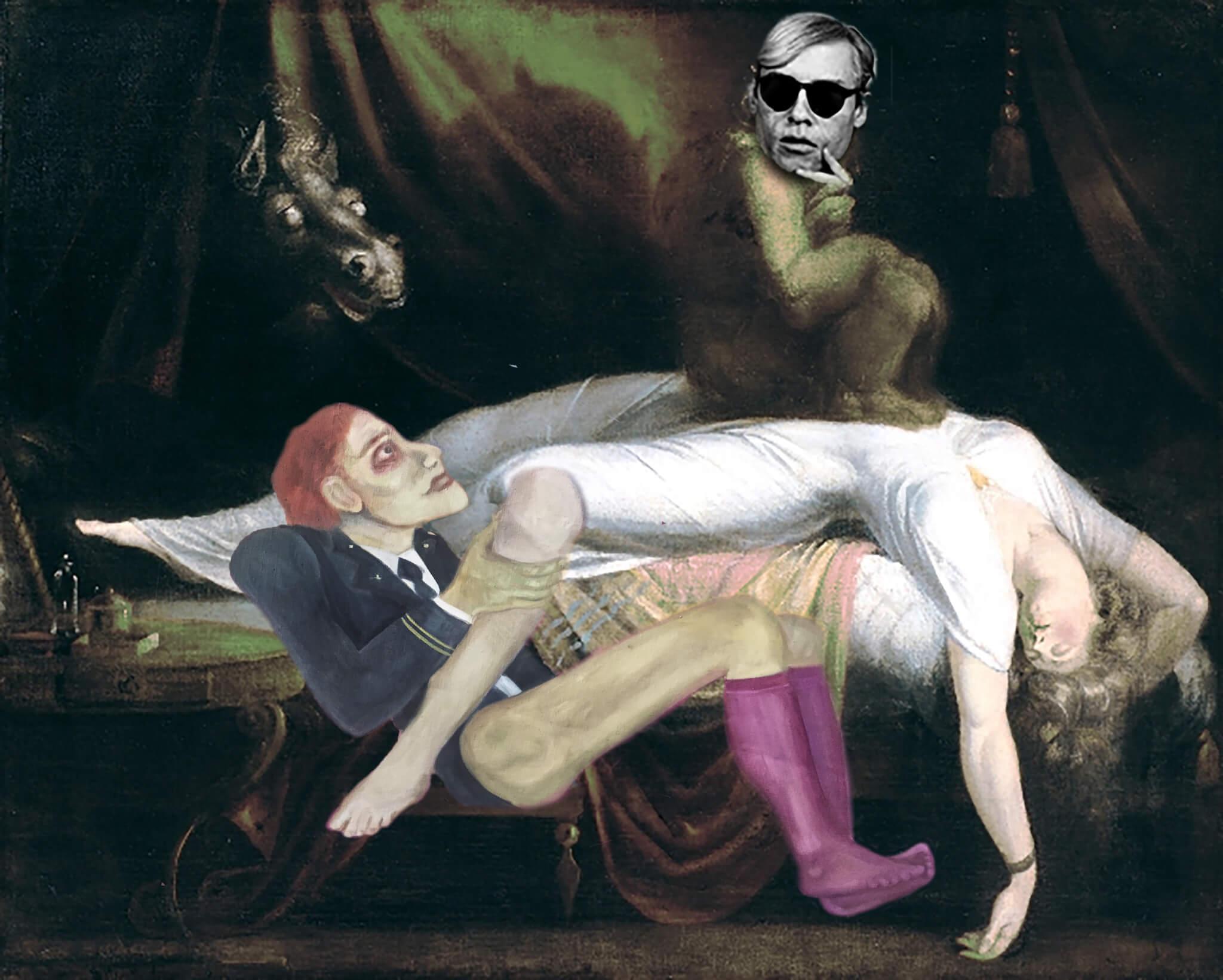 “Watching Warhol’s recording of his sleeping muse, boredom becomes mesmerizing at the closed gates of the other’s dream state. Clock time dissolves as a spectral reality begins to dilate. Factory superstar Ondine coined Warhol’s nickname Drella, a contraction of Dracula and Cinderella, signaling both his magical powers to transform reality and his vampiric relation to his entourage. He was also a sort of recording angel – decades before the world finally lost its distinction from reality TV – mining living history for experiences of the untimely and the eternal, fascinated by death about which he said: I never understood why when you died, you didn’t just vanish, everything could just keep going on the way it was only you just wouldn’t be there. I always thought I’d like my own tombstone to be blank. No epitaph, and no name. Well, actually, I’d like it to say ‘figment.'” – Jill Mulleady