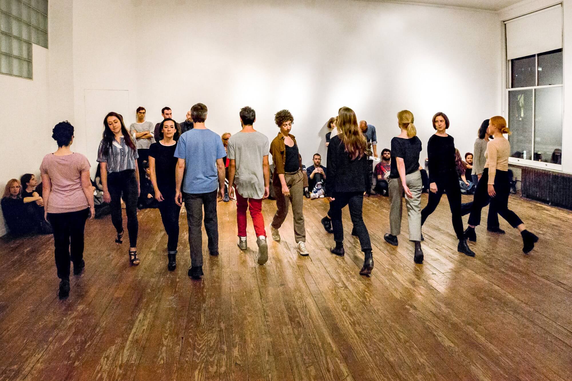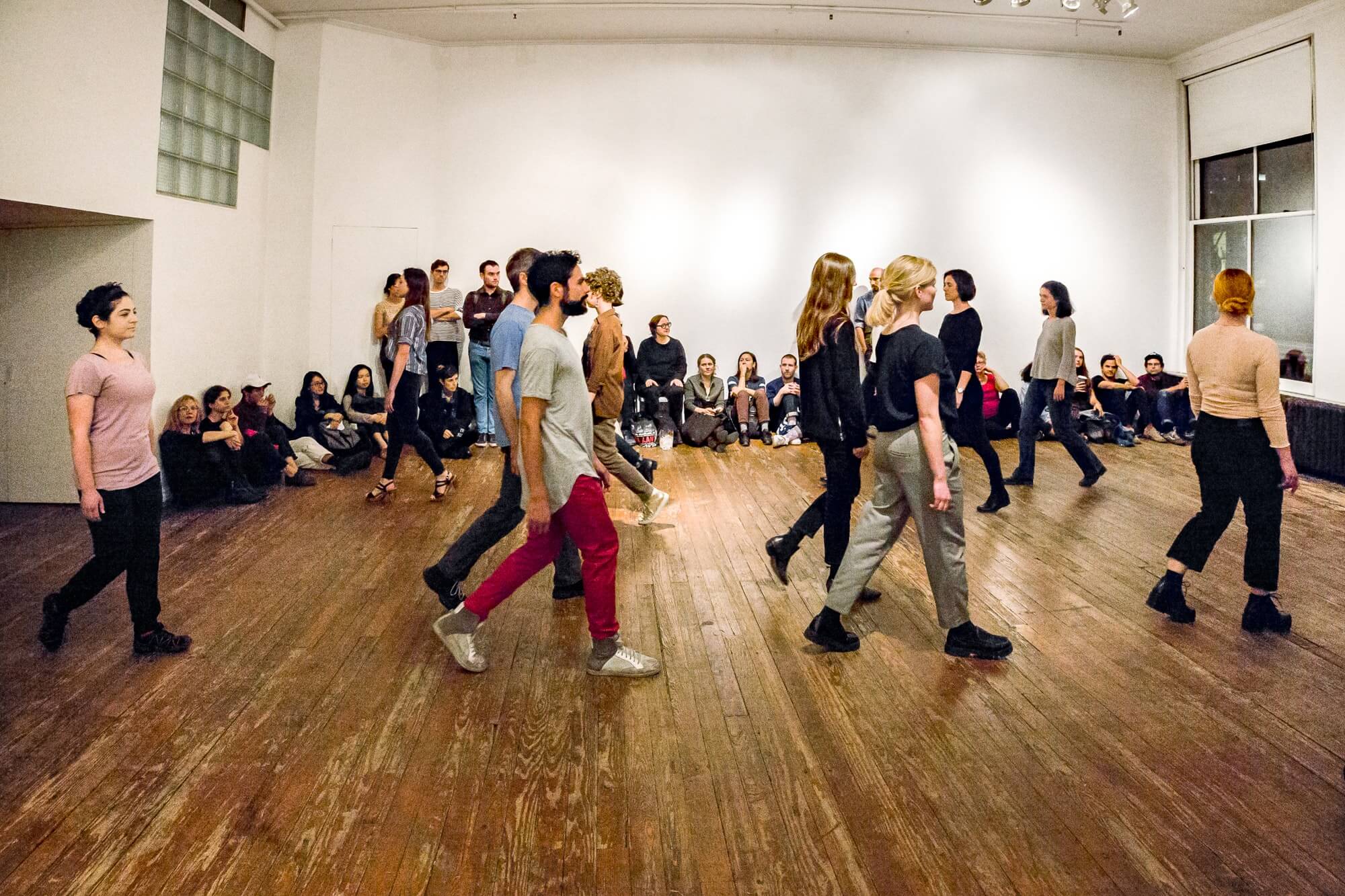 Contradance draws on the framework of contra dance traditions that organize a social dance using the form of A-B pairs. In a stripped back form, the mechanics of the choreographic operations are accentuated, as the dancers weave amongst one another, describing the architecture through sequences of movement. Each with varying degrees of formal training, dancers change partners and neighbors after each repetition which guides them through space.