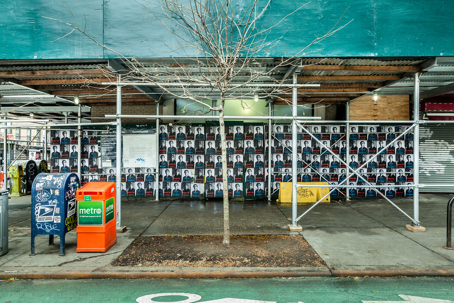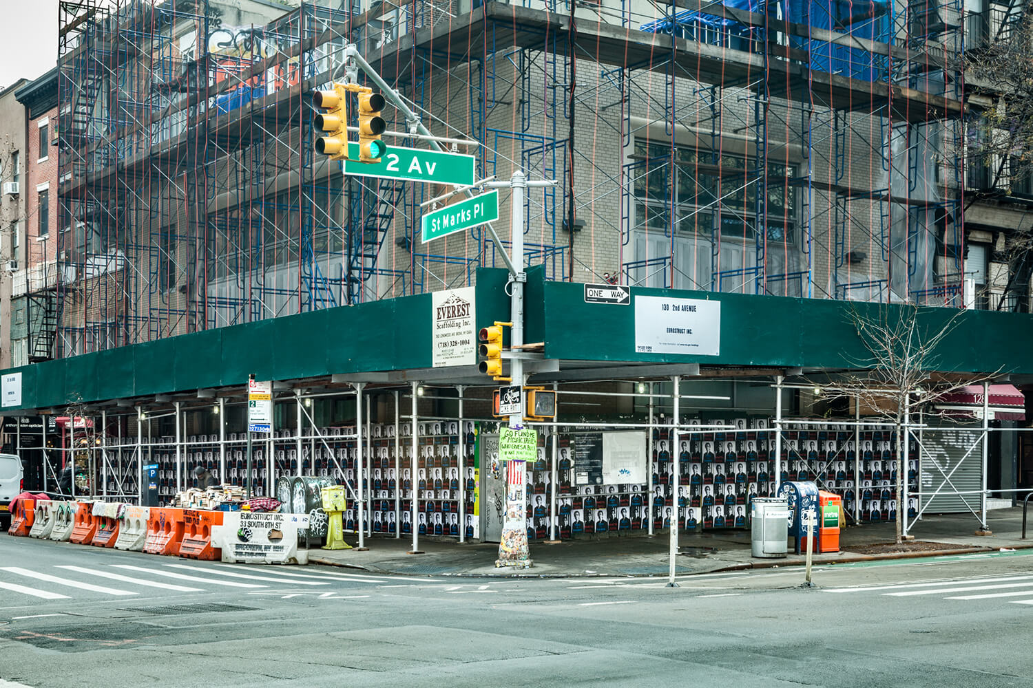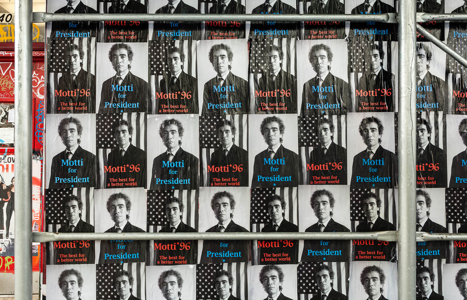 Gianni Motti’s US Presidential campaign posters from 1996, “Motti for President,” installed on the construction shed surrounding 38 St Marks Pl.