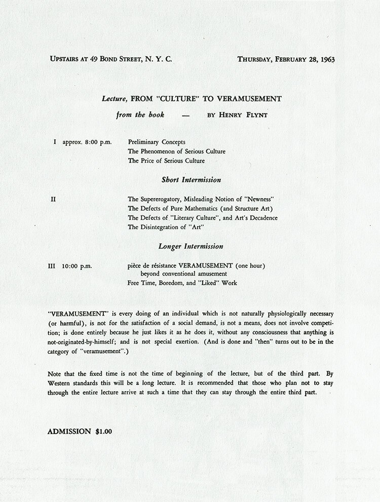 Henry Flynt will deliver a talk titled REVISITING MY PANORAMIC CRITIQUE OF CULTURE FIFTY-FIVE YEARS AGO, a retrospective consideration of the panoramic critique of culture he presented in Walter De Maria’s loft in February 1963. Before the talk, he will present a rock instrumental for electric violin, as yet untitled.