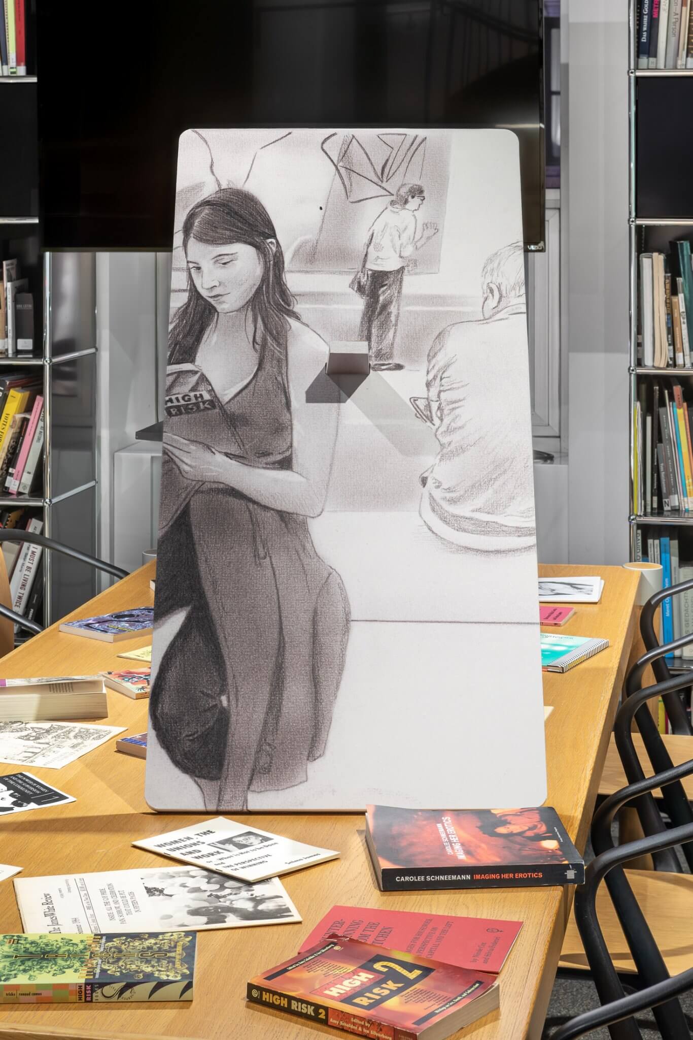 The installation features a selection of over 50 radical, rare, and out-of-print titles sourced primarily from the US and Italy. These books, available for visitors to read on-site, engage with increasingly surveilled and marginalized bodies of knowledge, including feminist theory, queer and postcolonial studies, poetry, and related discourses. Responding to the recent growing wave of state censorship, particularly within the United States, the selection centers on books published by High Risk, a provocative anthology series that evolved into an independent publishing house in the 1990s. Founded by Ira Silverberg and Amy Scholder, High Risk was renowned for amplifying transgressive voices and fostering critical conversations around sexuality, identity, and dissent.