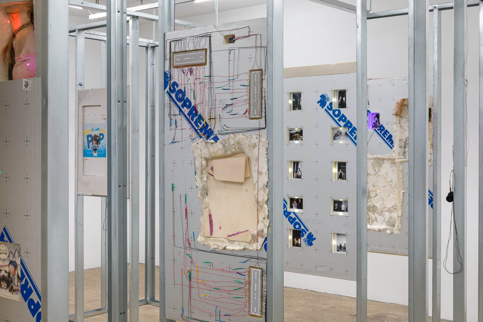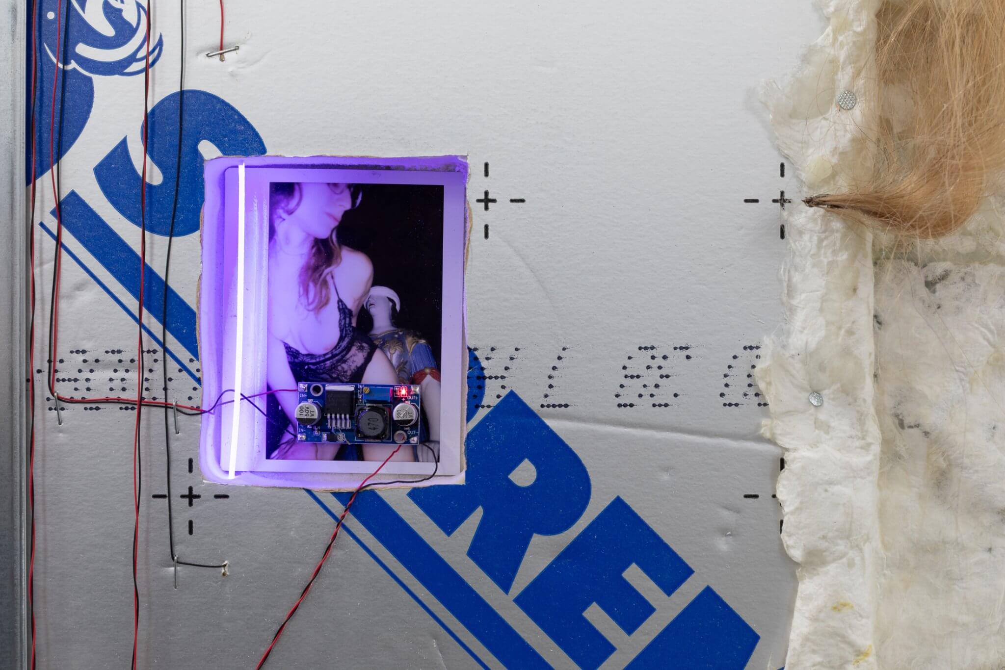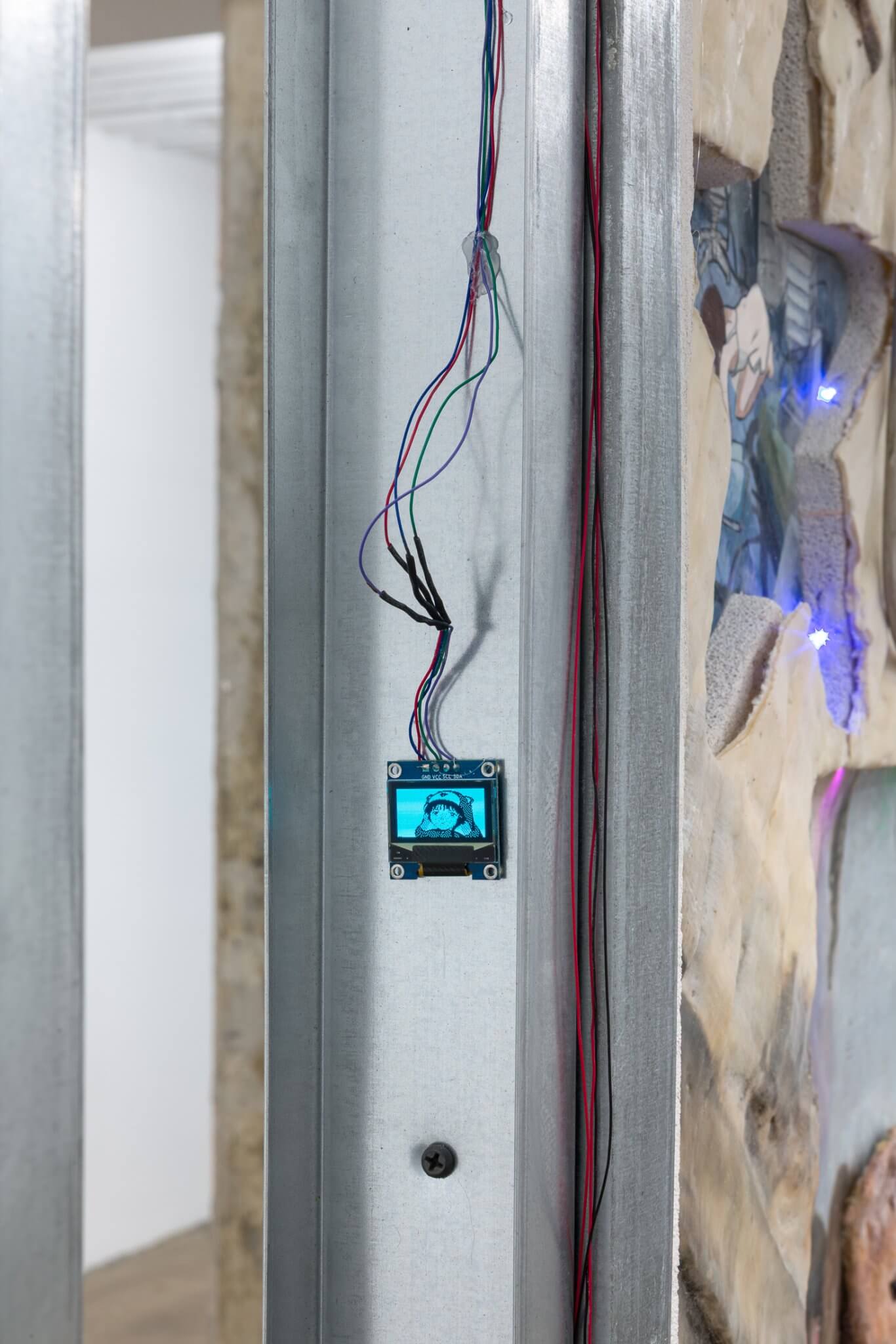 In the lower-level gallery, aluminum studs, which typically undergird walls, both guide the viewer’s navigation through the gallery space and frame the works on view. Filleul’s relief works are built from industrial objects such as insulation boards, foam panels, and concrete, onto which an eclectic variety of materials are applied, ranging from beeswax and mulberry fiber to hemp and LED lights. On the textured, illuminated surfaces of these works, which are often scaled to the proportions of an iPhone, Filleul creates constellations of images with traditional techniques such as clay molding, papier-mâché, tempera, and hot wax painting. Using the gallery’s architectural supports to stage continually shifting perspectives of the works, the sculpted and painted images — depicting anime characters, stuffed animals, and quotidian selfie shots — appear on one side of a given work, while the viewer’s spatial wandering engenders an encounter with a manipulated composition of electronic chips and wiring on the other side. In these ways, Filleul’s works challenge dematerialized conceptions of the online world, instead grounding its profound identity-producing and embodiment-altering effects through a materially attuned visual language.