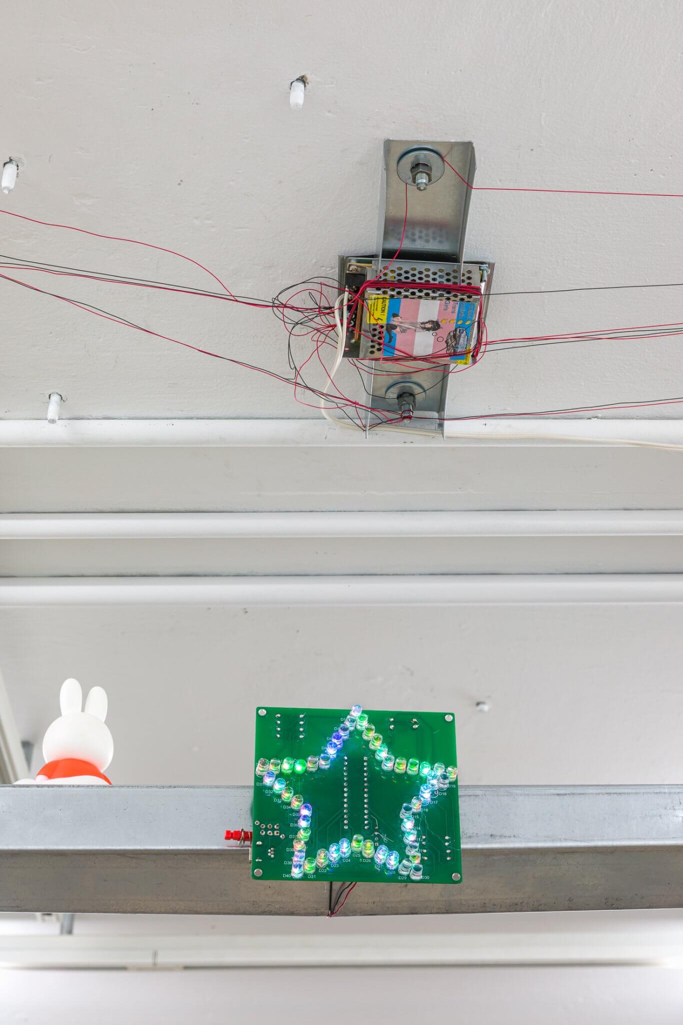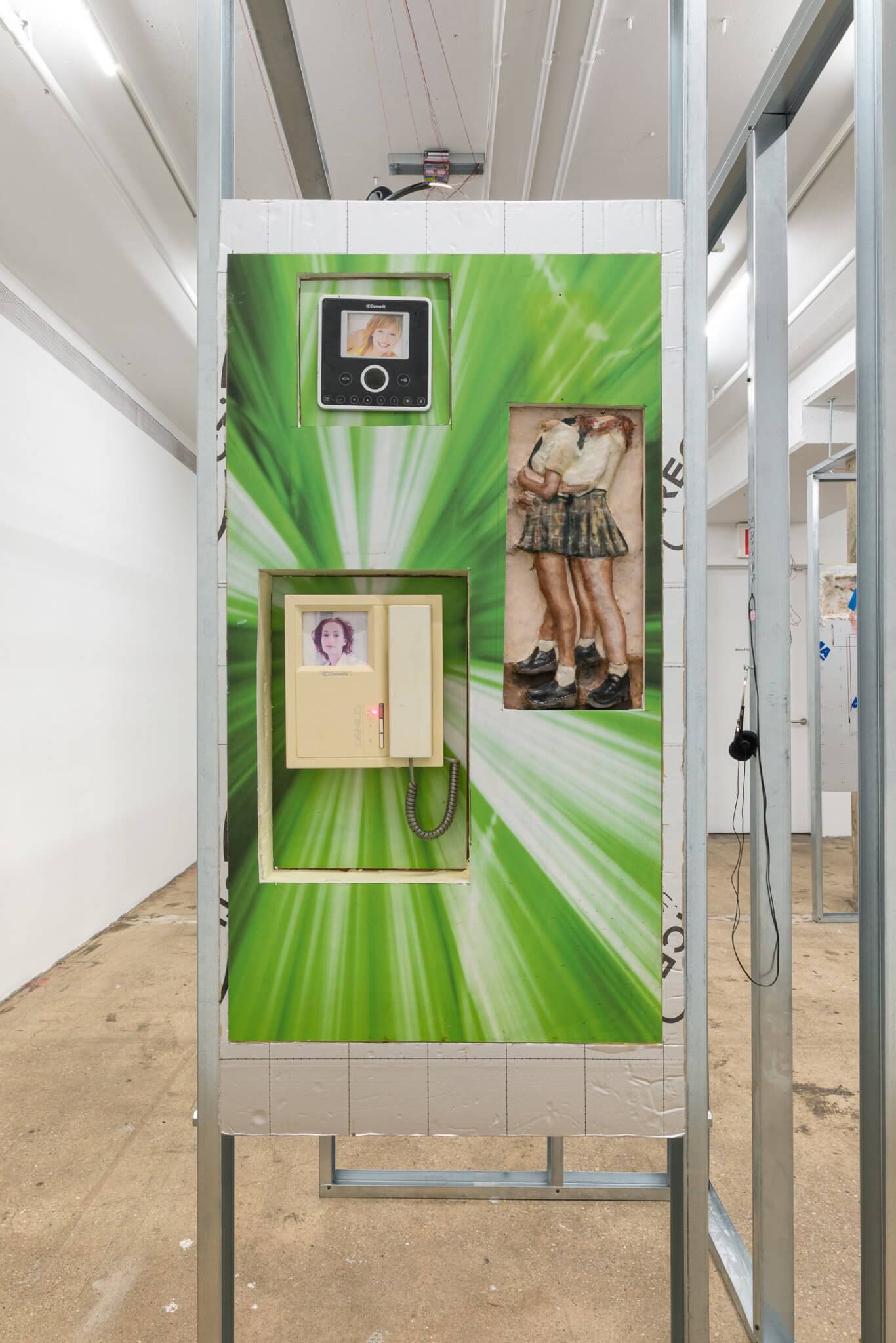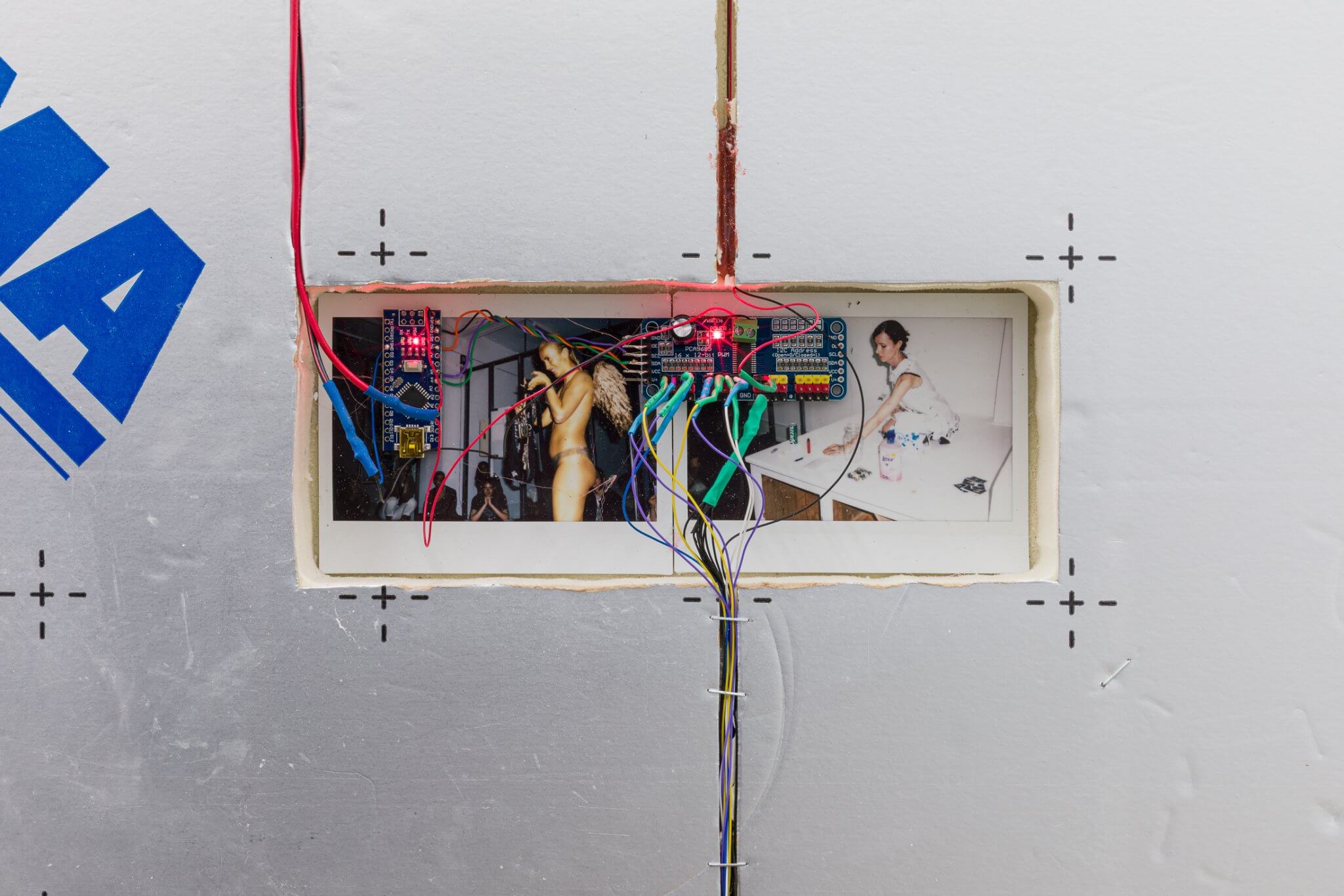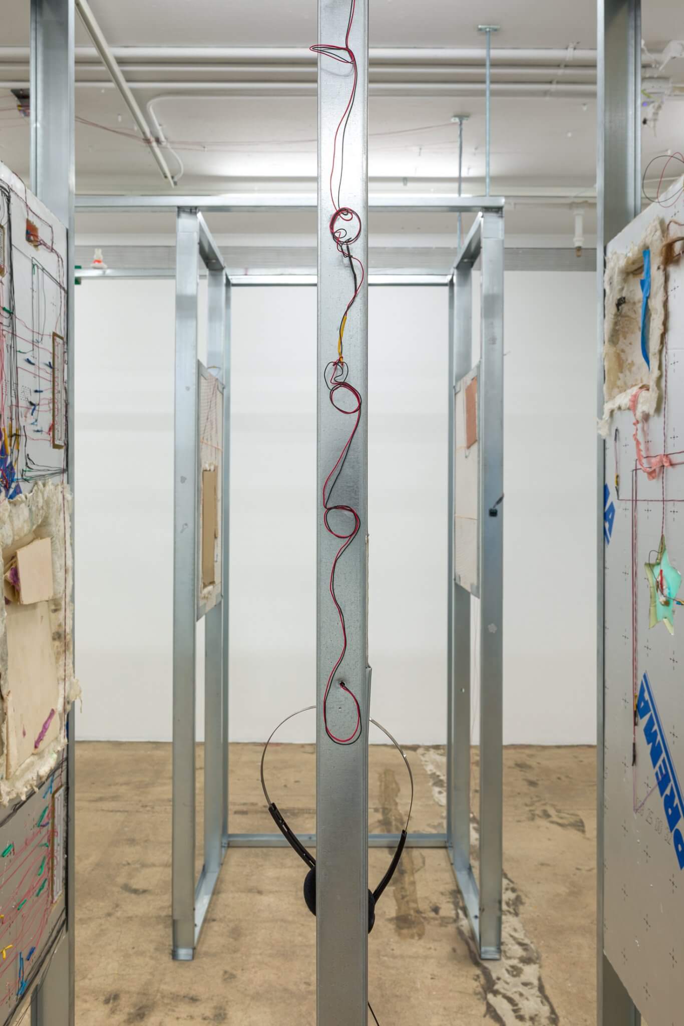 In the lower-level gallery, aluminum studs, which typically undergird walls, both guide the viewer’s navigation through the gallery space and frame the works on view. Filleul’s relief works are built from industrial objects such as insulation boards, foam panels, and concrete, onto which an eclectic variety of materials are applied, ranging from beeswax and mulberry fiber to hemp and LED lights. On the textured, illuminated surfaces of these works, which are often scaled to the proportions of an iPhone, Filleul creates constellations of images with traditional techniques such as clay molding, papier-mâché, tempera, and hot wax painting. Using the gallery’s architectural supports to stage continually shifting perspectives of the works, the sculpted and painted images — depicting anime characters, stuffed animals, and quotidian selfie shots — appear on one side of a given work, while the viewer’s spatial wandering engenders an encounter with a manipulated composition of electronic chips and wiring on the other side. In these ways, Filleul’s works challenge dematerialized conceptions of the online world, instead grounding its profound identity-producing and embodiment-altering effects through a materially attuned visual language.