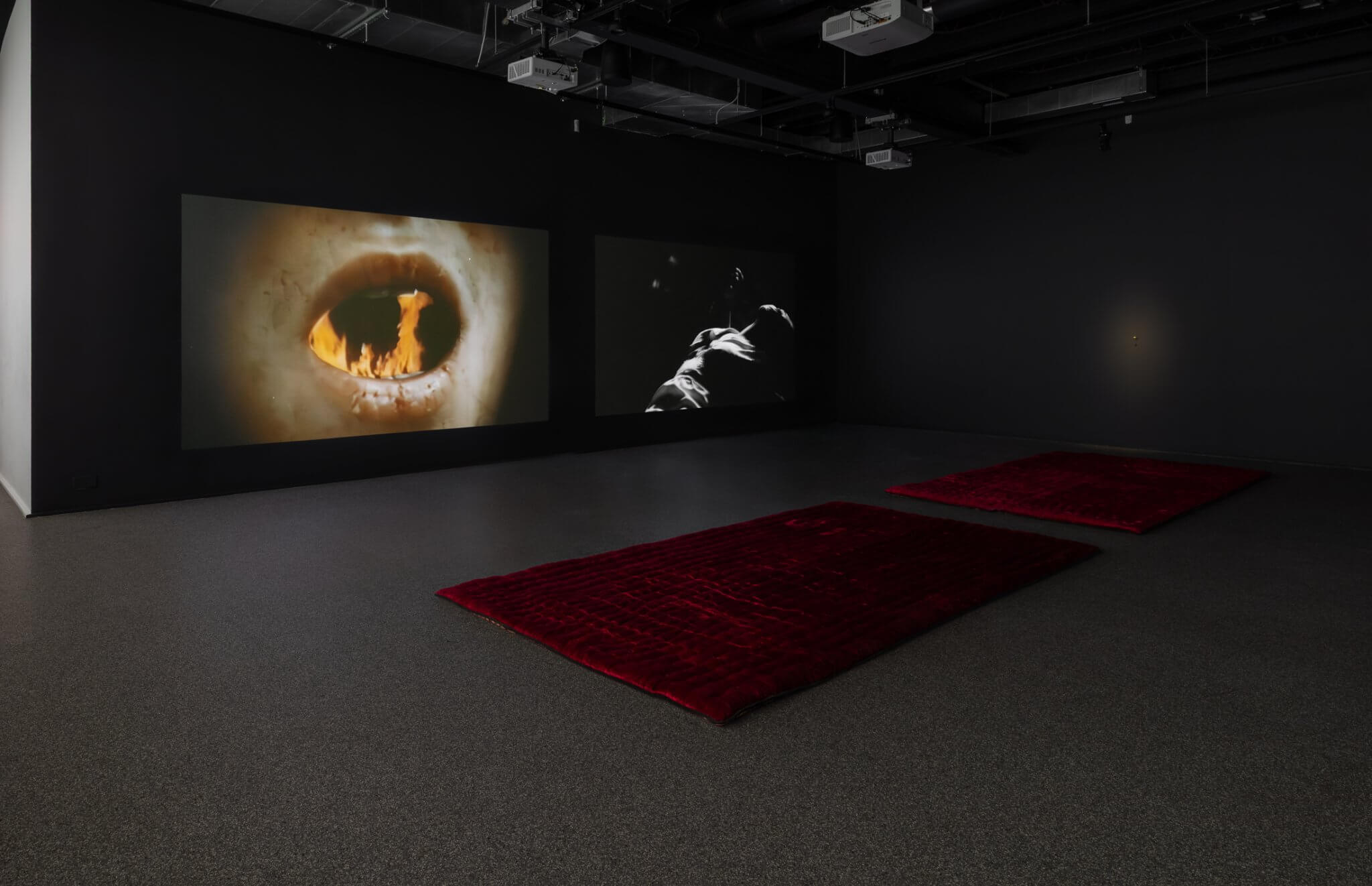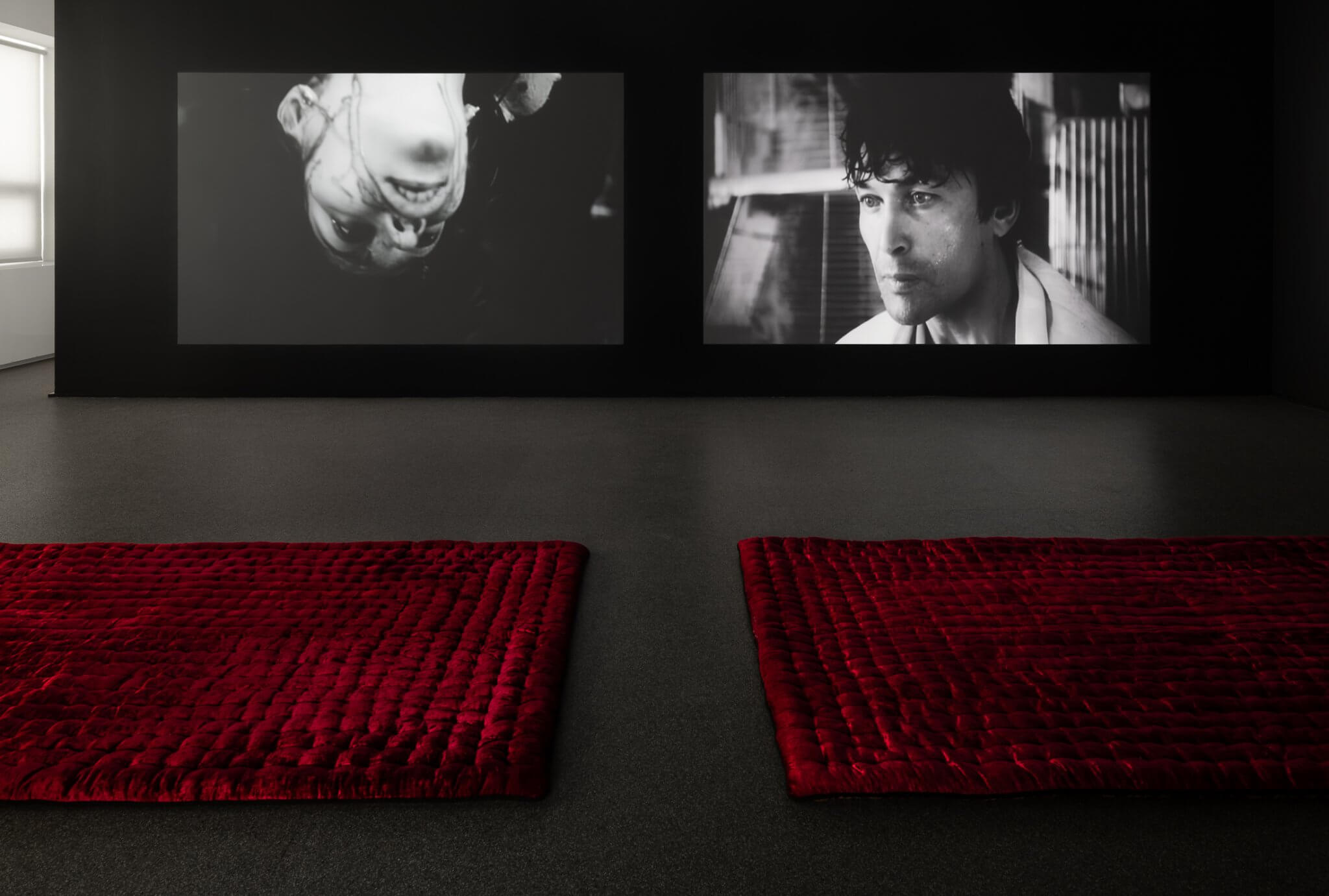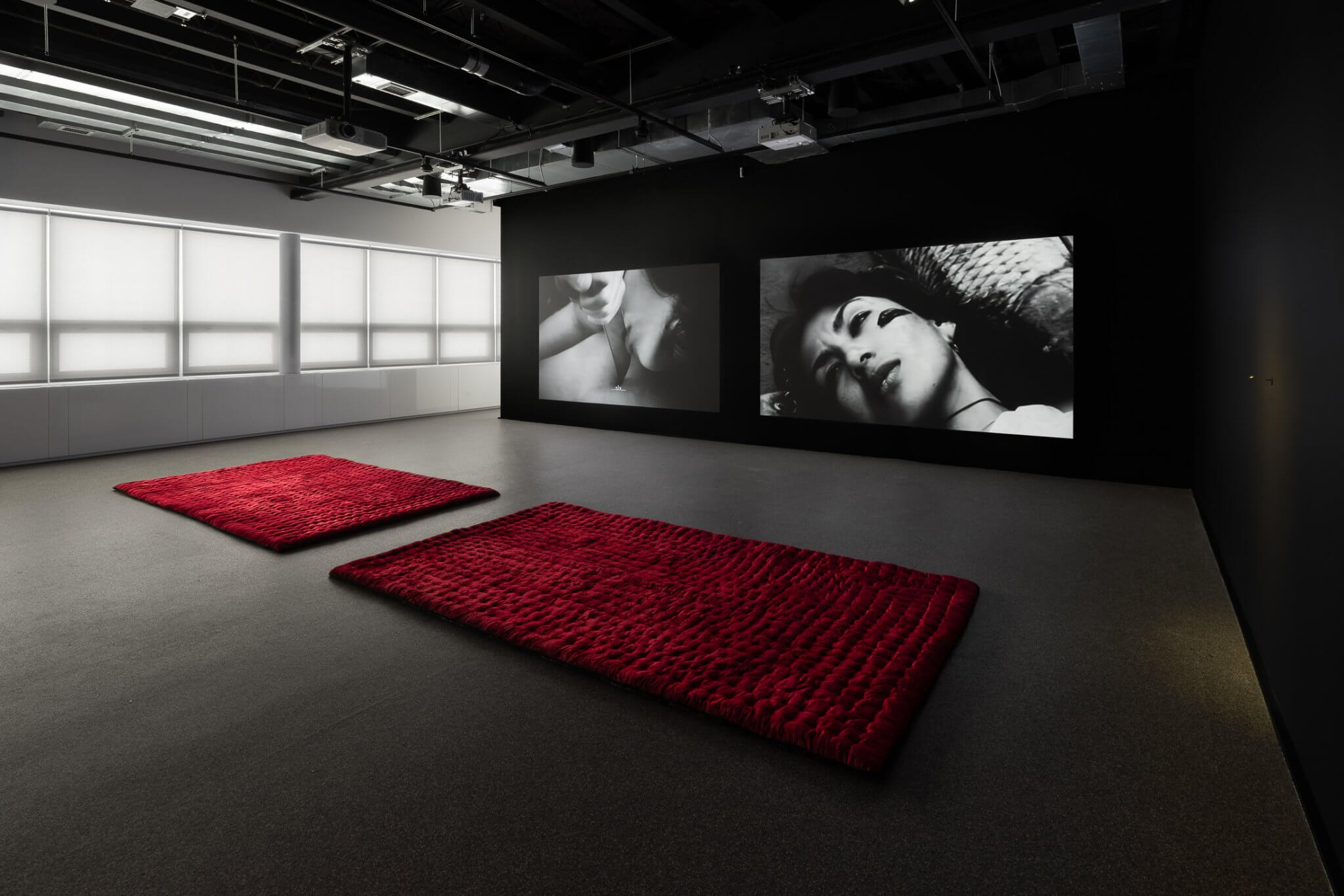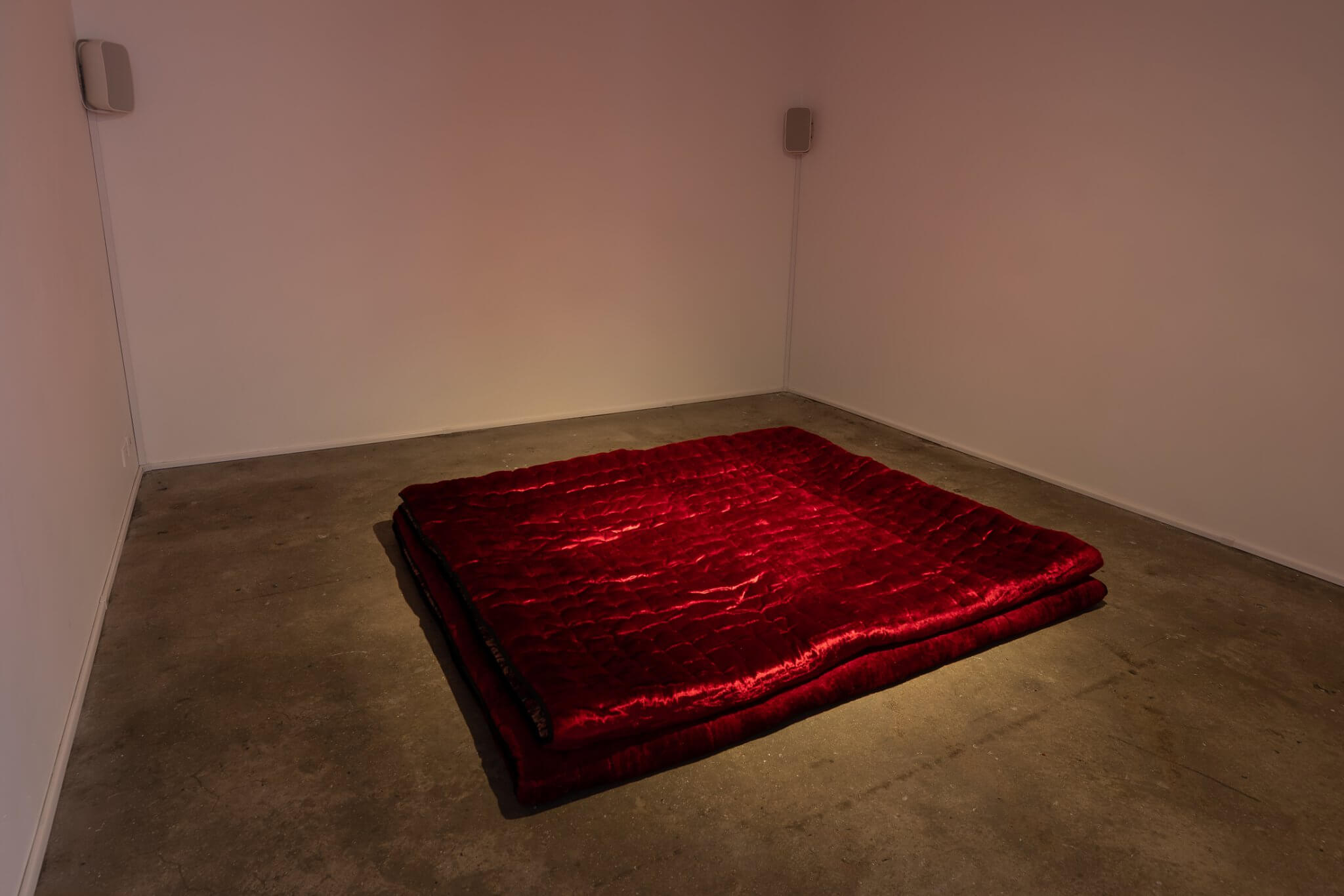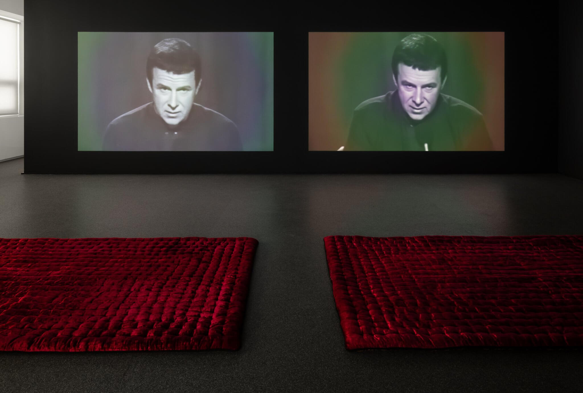 On the second floor in the reading room, a complementary sound work, recorded in the forest at night, attunes listeners to a hallucinatory drifting state. In the adjacent gallery space, the two-channel film installation Swan Lake brings together archival footage from Central Asian cinema. The title references the consistent broadcasts of Tchaikovsky’s ballet on state television following the passing of political leaders and during moments of turmoil and transition, such as when the Soviet Union ceased to exist. The footage further includes shots of Anatoly Kashpirovsky, whose televised hypnosis sessions in the late 1980s during the regime’s final years attempted to proselytize audiences through regime-aligned messages. Among those hypnotized was Ismailova’s grandmother, evoking transhistorical and technological parallels with the hallucinatory properties of the walnuts. Traditional kurpacha mattresses invite viewers to drift into this liminal space between wakefulness and sleep, denial and transformation.